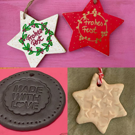 Fertige individuelle Anhänger aus lufttrocknendem Ton mit Stempeltechnik für den Weihnachtsbaum und / oder als Geschenkanhänger.